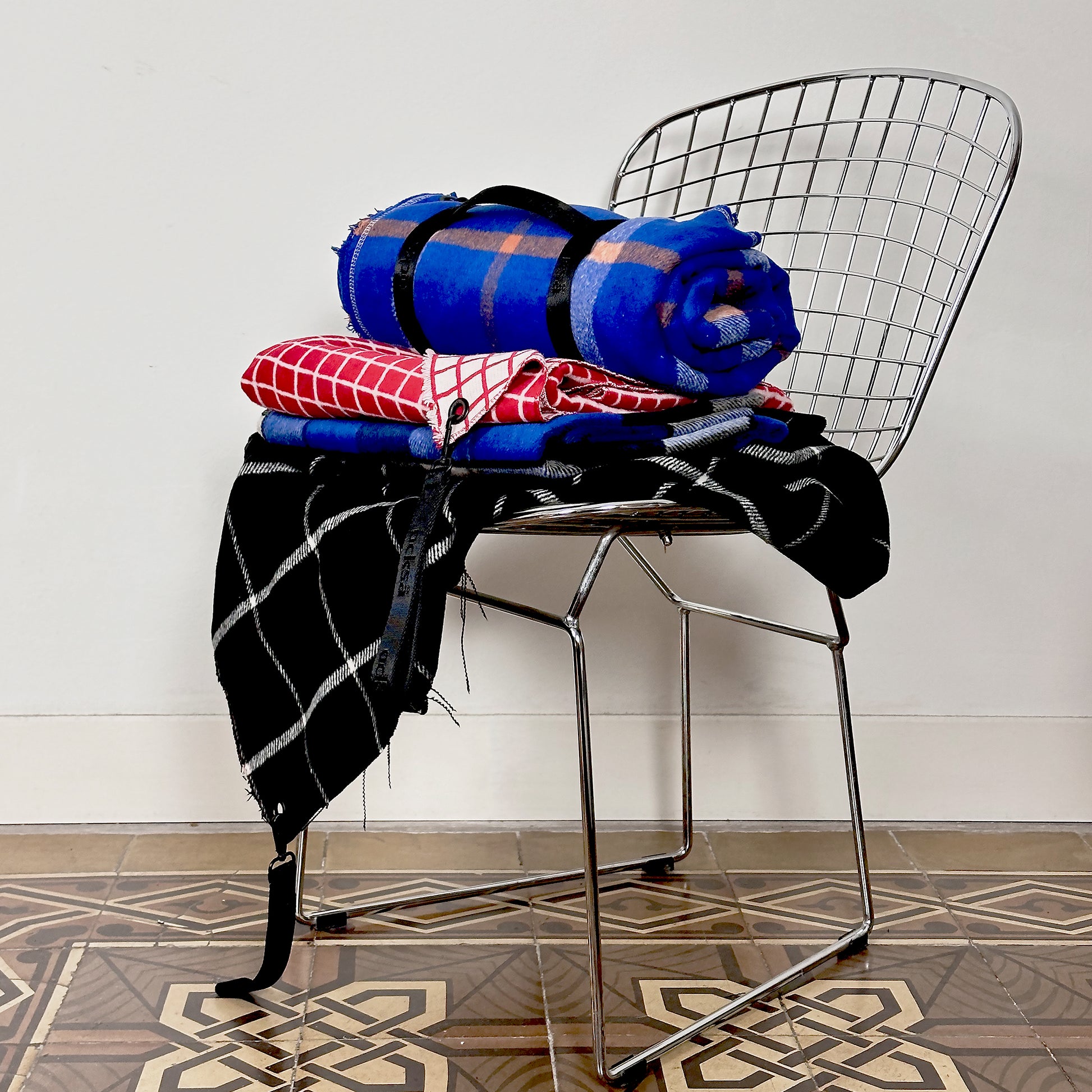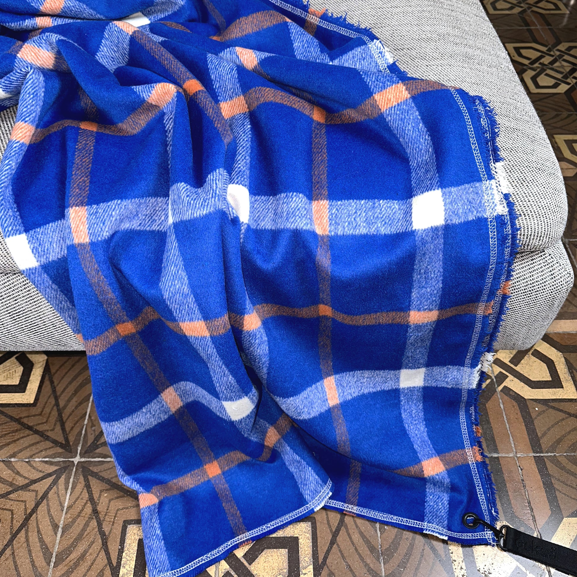 Jacquard-woven blanket made from cotton & acrylic wool. The colours of the pattern are mirrored on the opposite side. Wool Blanket with puller and strap case.